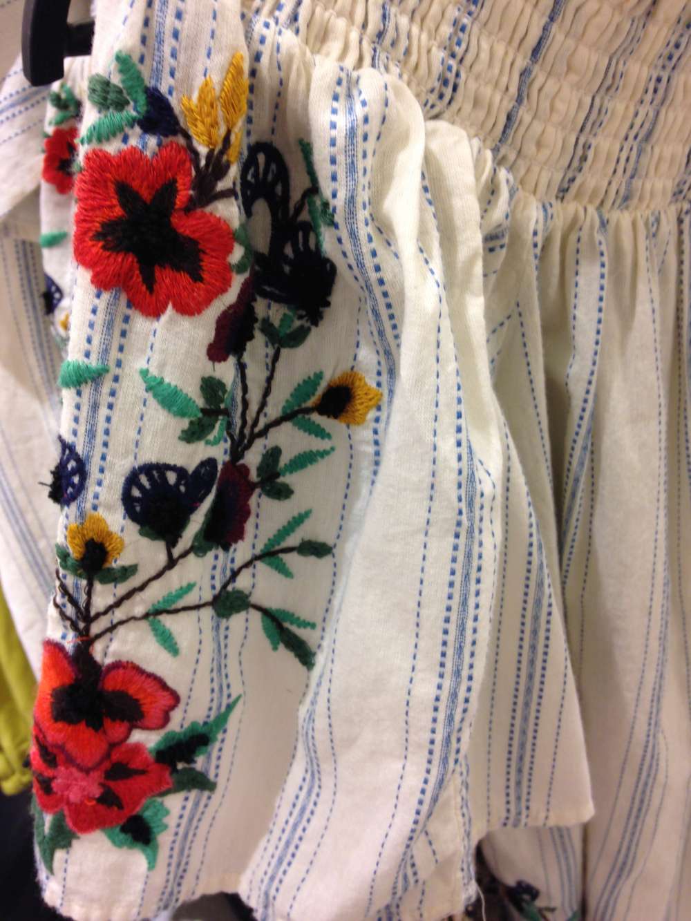 Zelf kleding maken is één ding, maar je kleding voorzien van de prachtige borduursels die je dit seizoen overal ziet, is echt iets anders. Ga er maar aanstaan. Stoffen met deze borduursels zijn schaars. Dus eerlijk is eerlijk, in dat geval zoek ik online, of spoed ik me naar een winkel zoals Zara. Daar vind je ze in bosjes, de tops en tuniekjes, voorzien van dat tikje folklore: borduursels, kwastjes en rimpeldetails bij de hals of de (poffende) mouwen. Beeldschoon, ik hou ervan! Ze staan leuk in combinatie met een superwijde lange rok voor het echte gipsy-gevoel of gewoon met een jeans. Heb je wel een mooie stof weten te bemachtigen? Hier vindt je wel het patroon voor de off shoulder top!