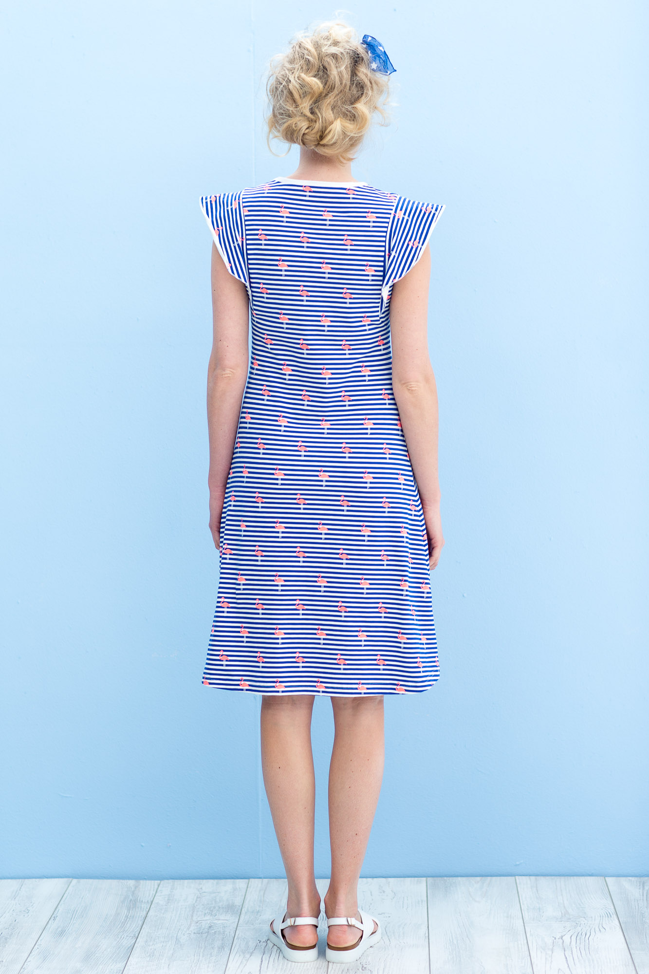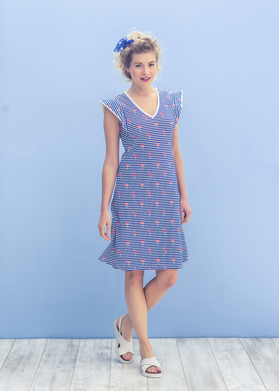 Jurk 25 is een ideaal item voor zonnige dagen. Het gerende model heeft frivole vlindermouwtjes die zowel voor als achter eindigen bij schuine coupe-naadjes. De V-hals is afgewerkt met elastisch biaisband.