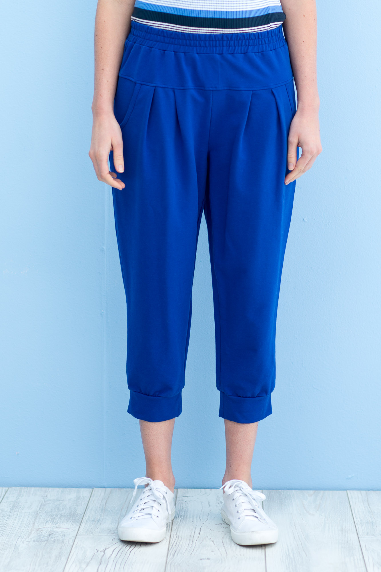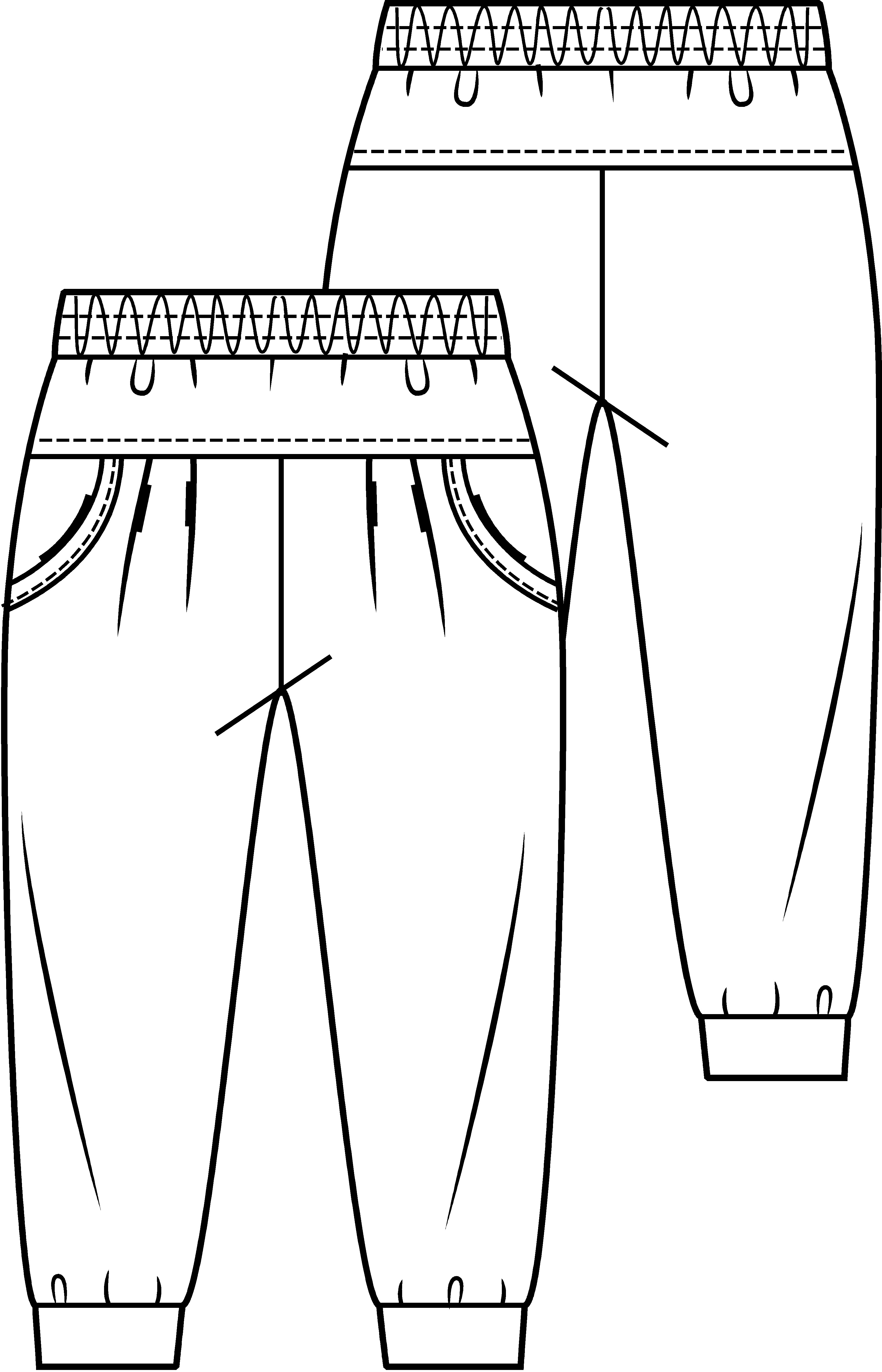 Broek 23 is een zevenachtste joggingachtig model met elastiek in de taille, een rechte heuppas en ronde steekzakken. De pijpen zijn afgewerkt met een stoffen boord.