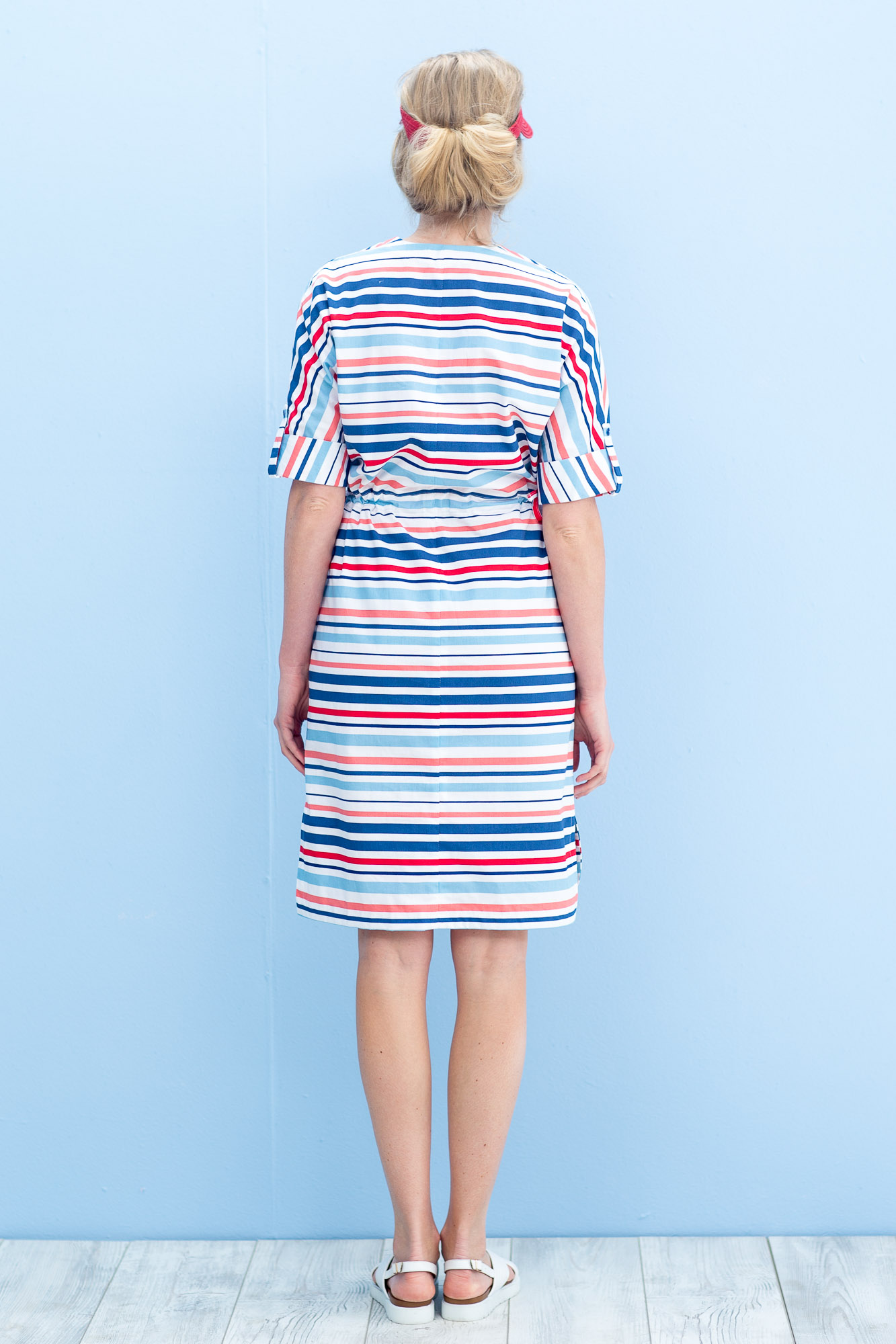 Jurk 16 is een comfortabele model en heeft lummels aan de raglanmouwen en in de taille strikkoorden aan beide kanten.