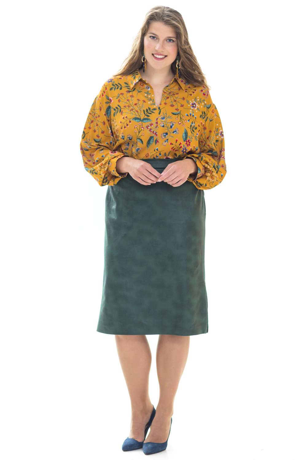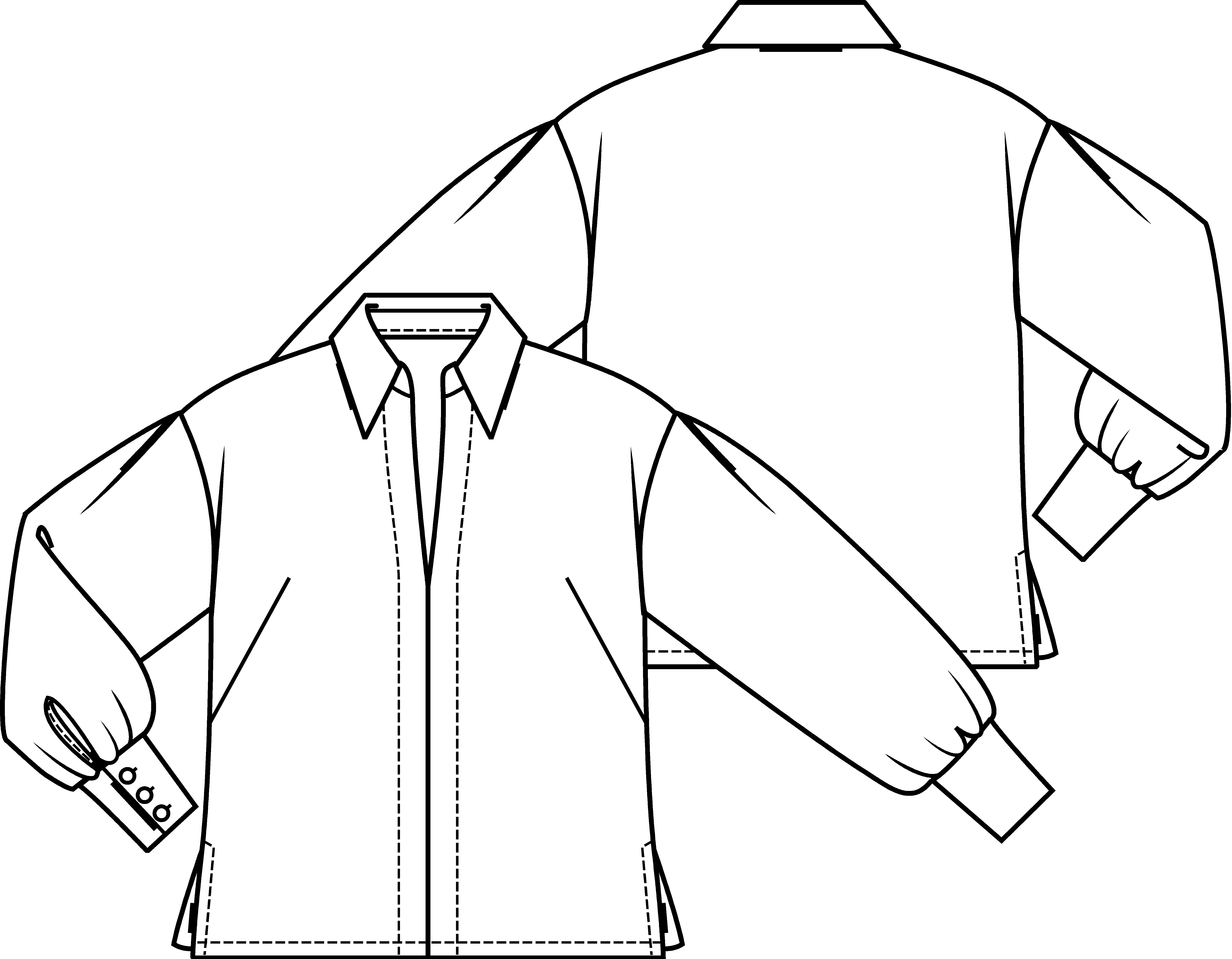 Blouse 11 is een rechte model heeft een kraag op staander, lange manchetten aan de mouwen en splitjes in de zijnaden.
