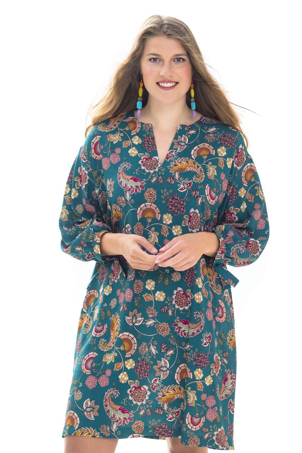 Jurk 9 is eenvoudige model is iets oversized – ideaal voor verschillende figuurtypen – en heeft laag ingezette driekwart-pofmouwen. Bij de buste schuine coupenaden en in de zijnaden zijn zakken gemaakt.