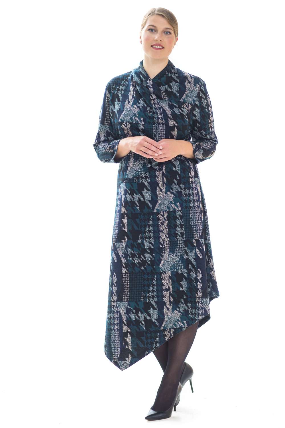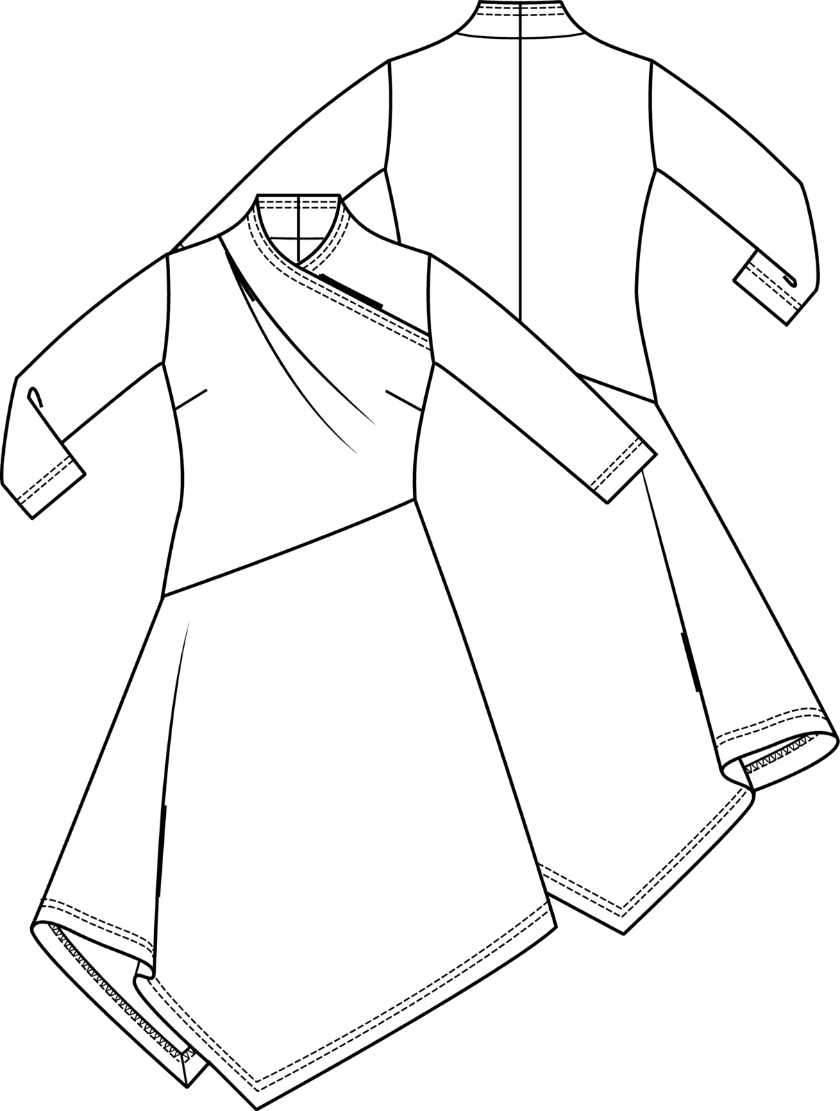 Jurk 10 is een asymmetrisch model, heeft een opstaande halslijn, een overslageffect en driekwartmouwen.