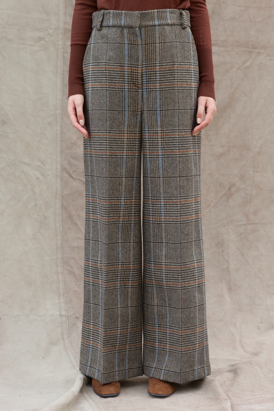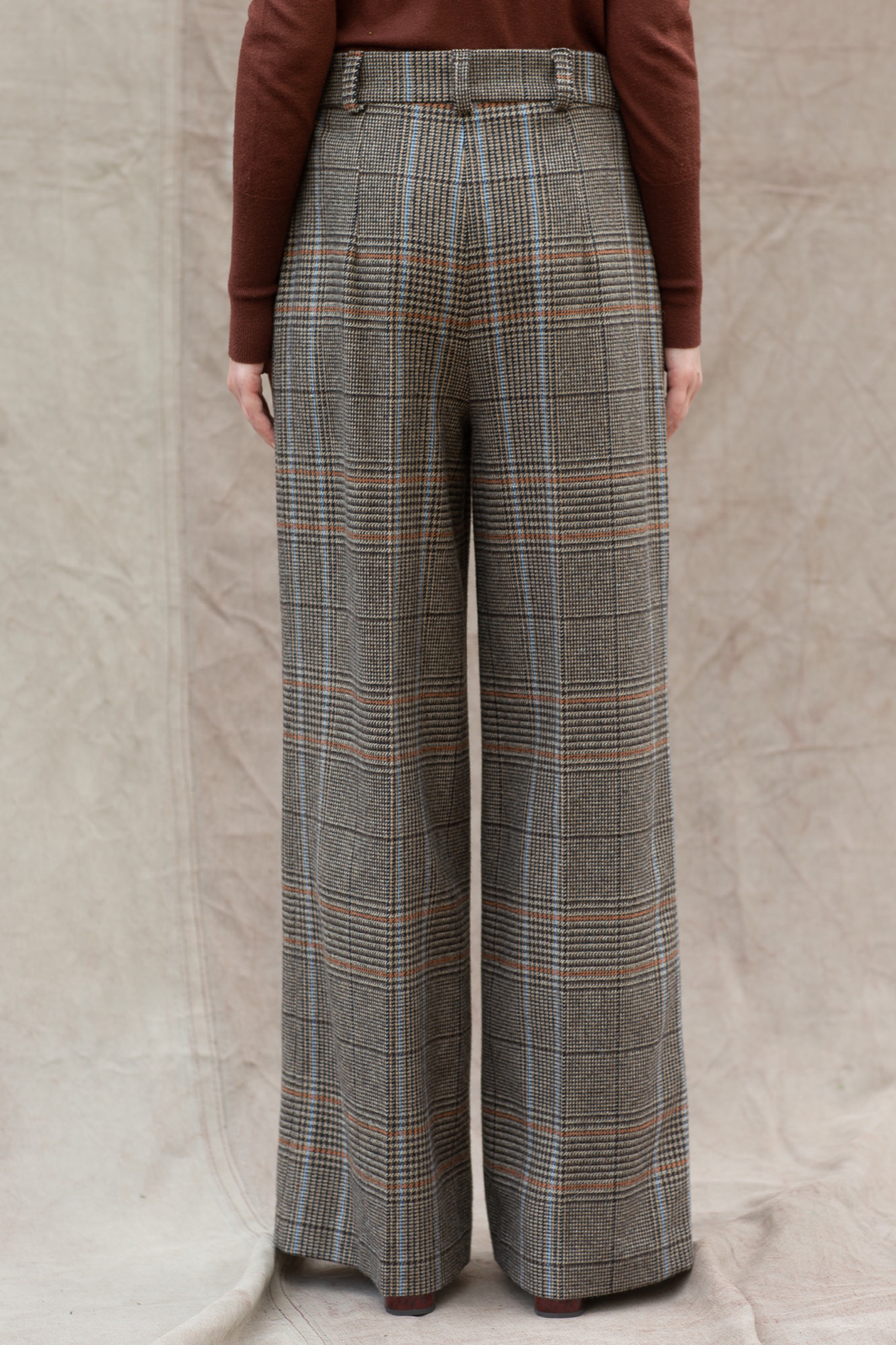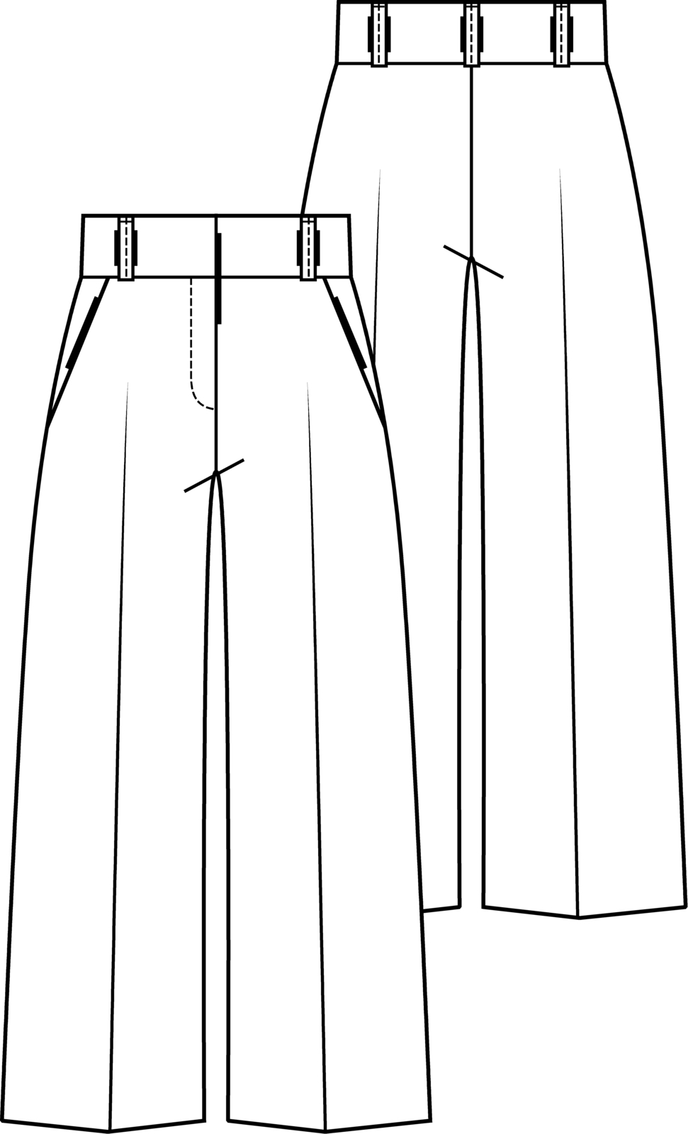 Broek 15 heeft een hoge tailleband met lusjes, schuine steekzakken en persvouwen in de pijpen.