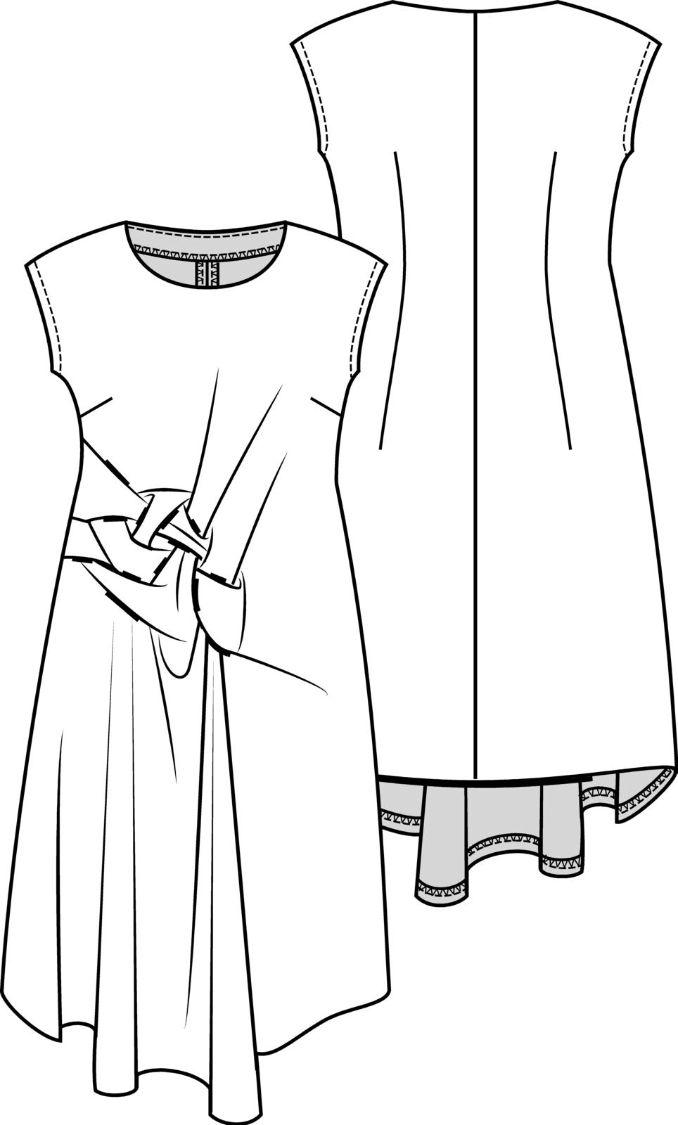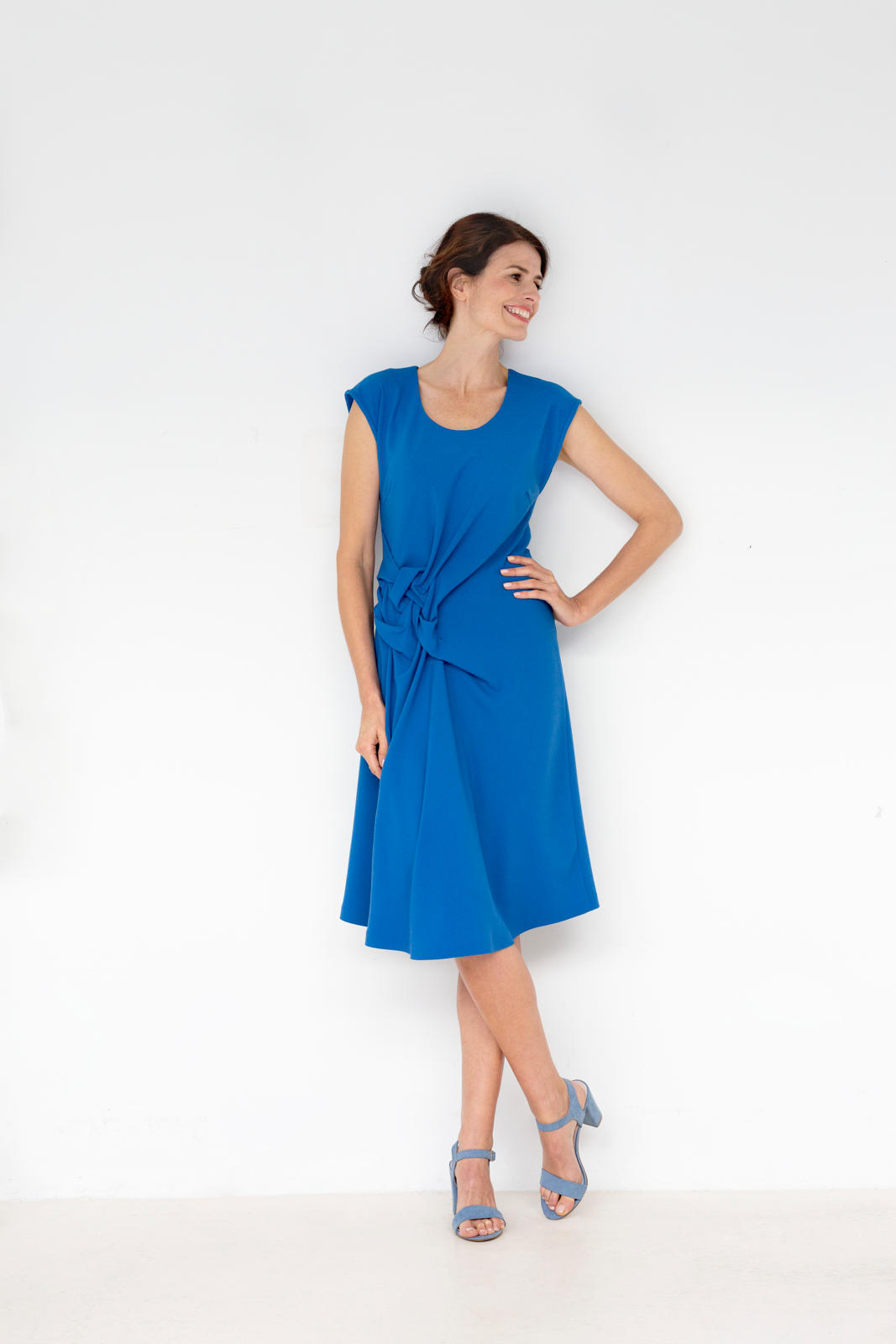 De jurk met decoratieve knoop behoeft geen ingewikkeld vlechtwerk al doet het oog anders geloven. Het is een compositie van plooien die kruislings over elkaar heen vallen, een techniek die wat wegheeft van origami, de eeuwenoude Japanse vouwkunst!
