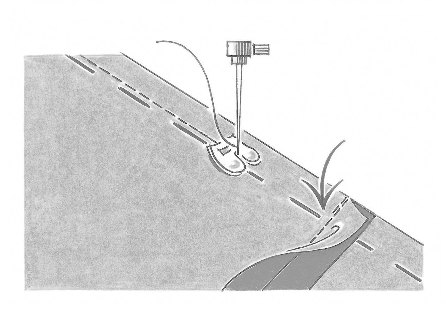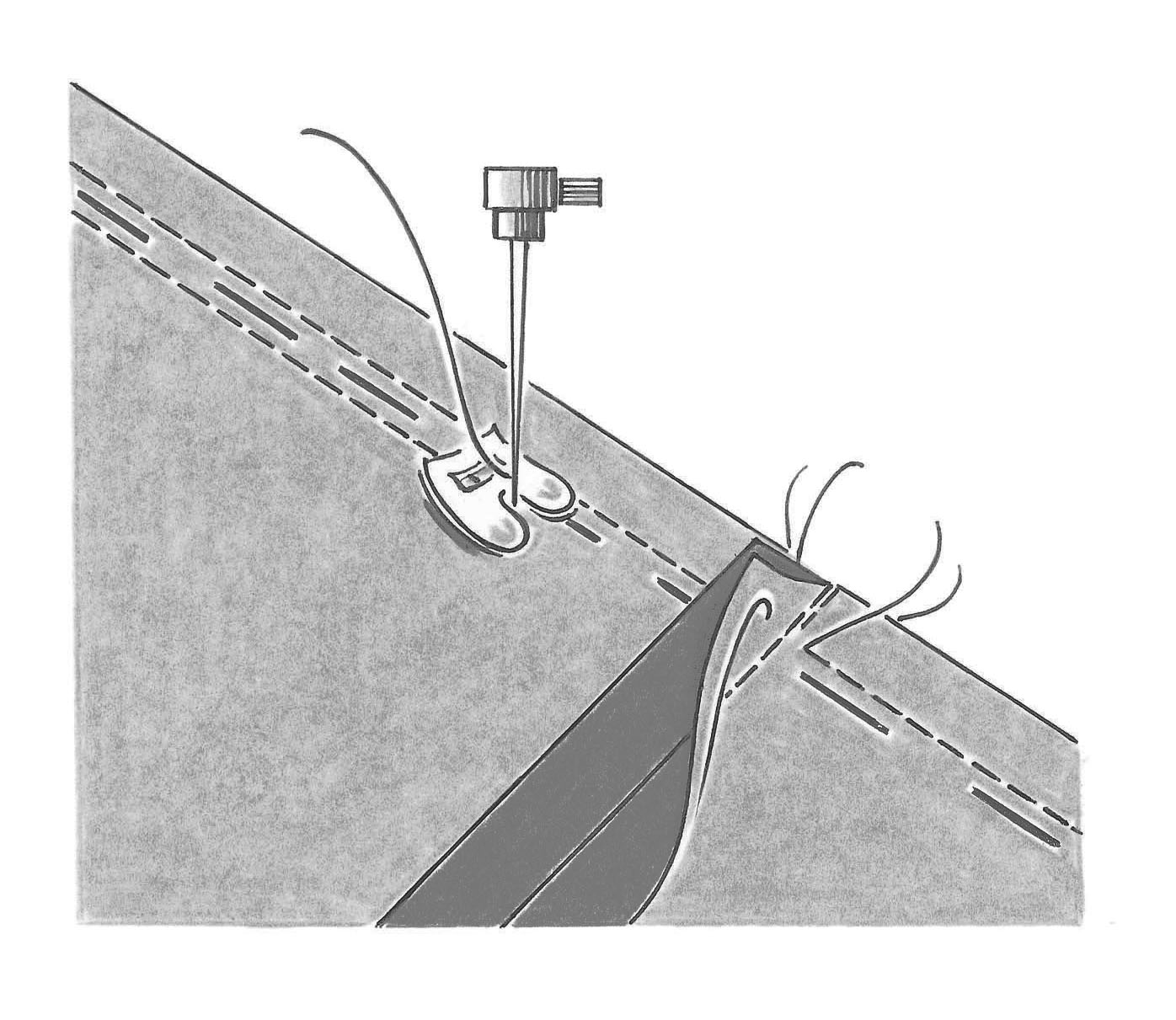 - Stik de strook stof nogmaals door; nu 3 mm onder de patroonlijn. • Knip de draden weer niet te kort af. Laat ze 10 cm loshangen.
