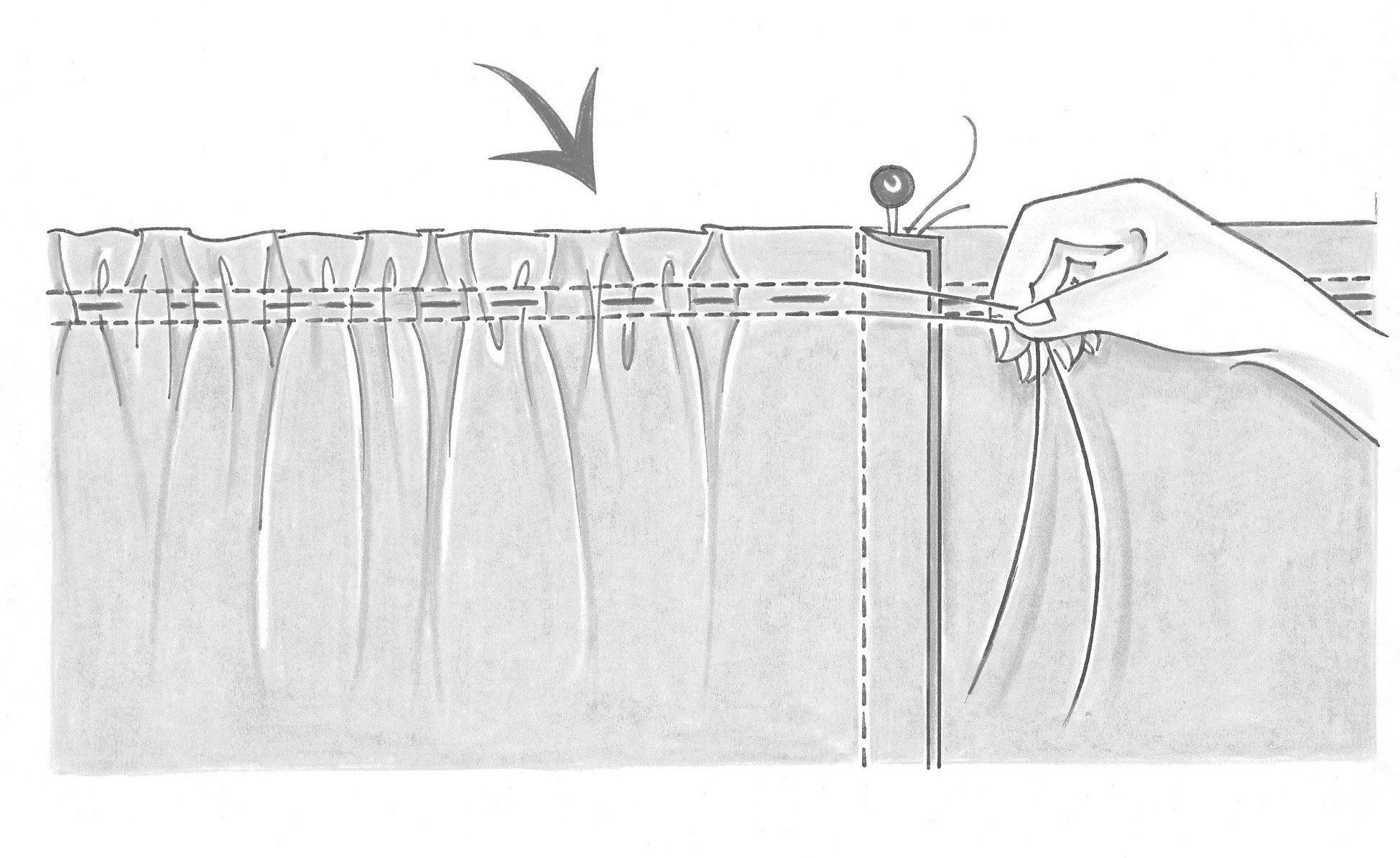 Let op: zorg dat de draden niet breken: schuif de stof/rimpeltjes telkens een stukje verder richting de speld totdat je de goede lengte hebt.