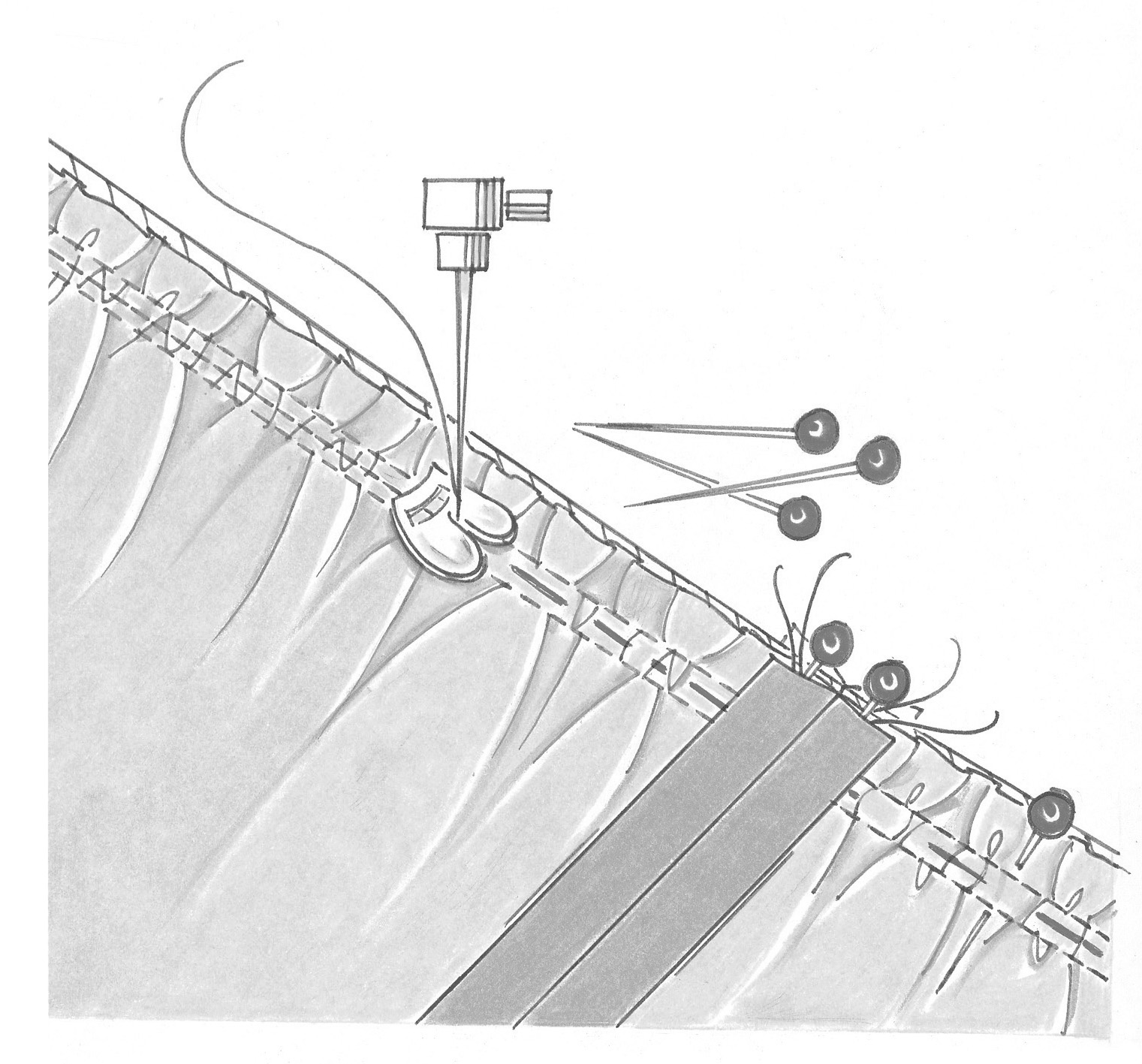 Je gaat de strook/ruche in twee delen rimpelen. Zet bij een naadje een speld dwars in de strook/ruche. Wikkel de draden in een achtvorm op deze speld om ze tijdelijk, stevig vast te zetten.