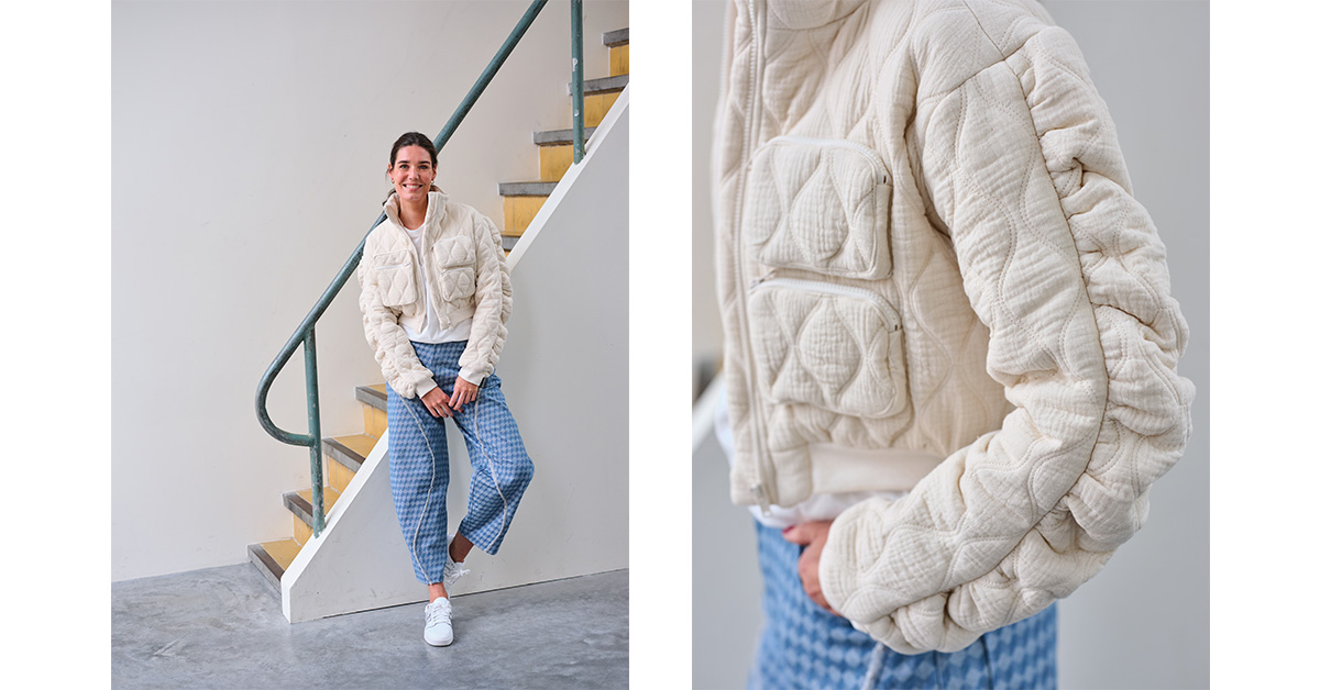 Blauw bombervest met hoge taille- en mouwboorden – uit Knipmode editie 2504-11