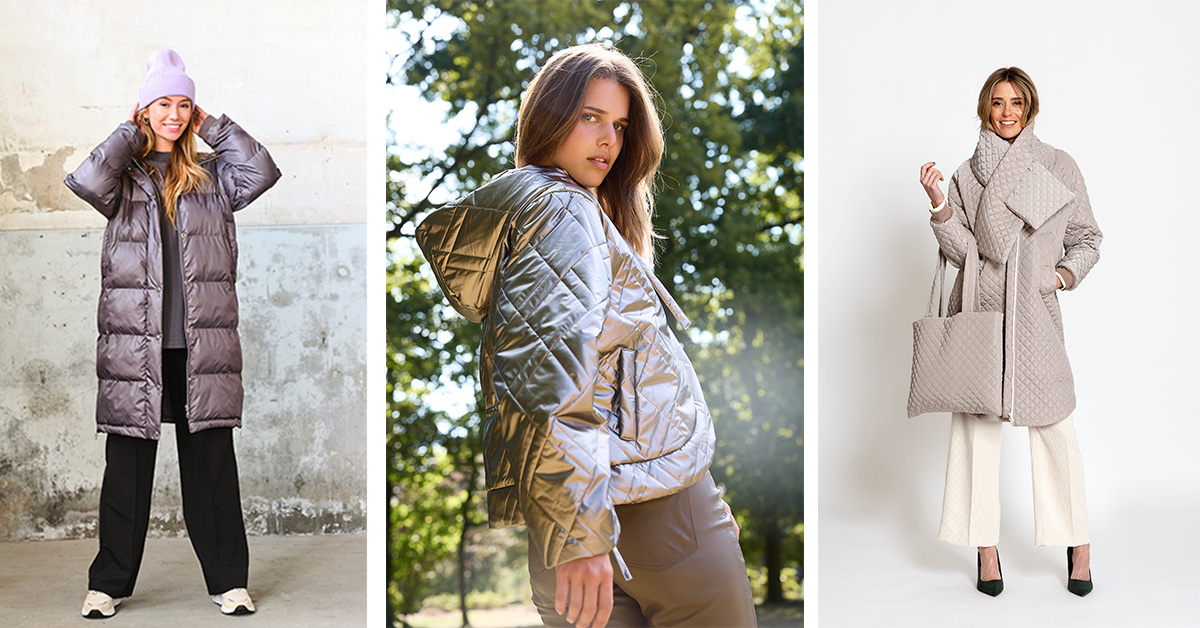 Zie hieronder enkele modellen: een lange pufferjas met manchetten van bijpassende boordstof en lange ritssplitten in de zijnaden die van onderaf kunnen worden open geritst om comfortabel te kunnen fietsen, een lichtgewicht jas die warm aanvoelt en perfect te dragen is over zowel een broek als een jurk, en een gewatteerde jas met zachte ribboorden voor een sportieve, moderne look.