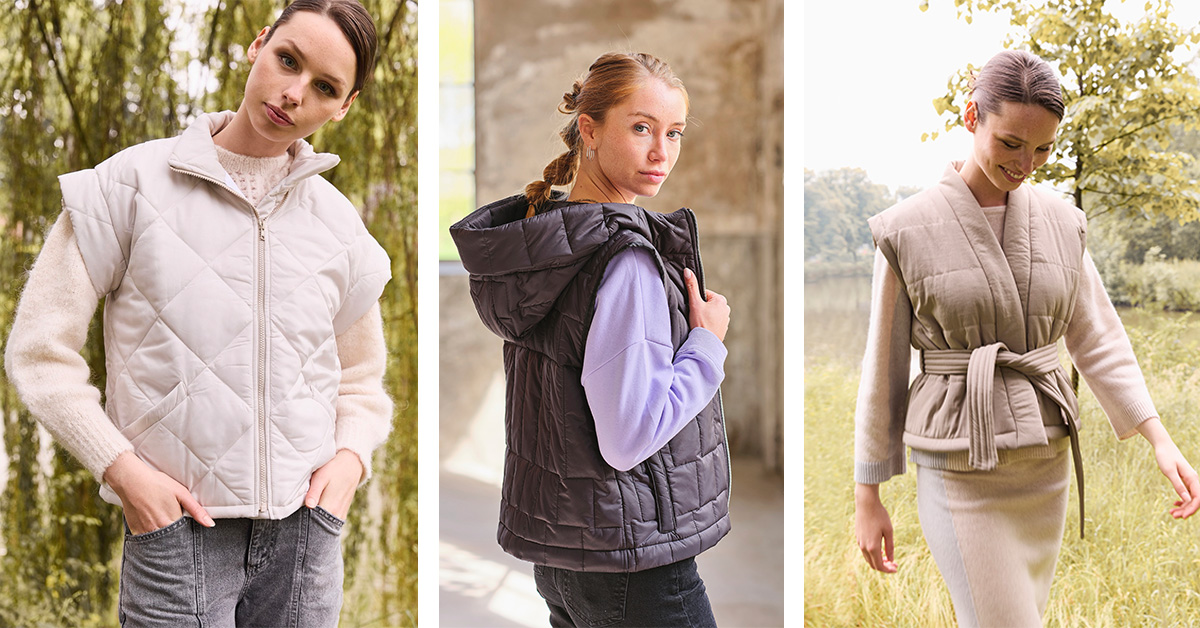 Kussenachtige texturen en mooie doorgestikte motieven, de nieuwe bodywarmers en gewatteerde jassen zijn niet alleen mooi stylish maar ook perfect voor laagjes combinaties die je van herfst tot lente warm houden.