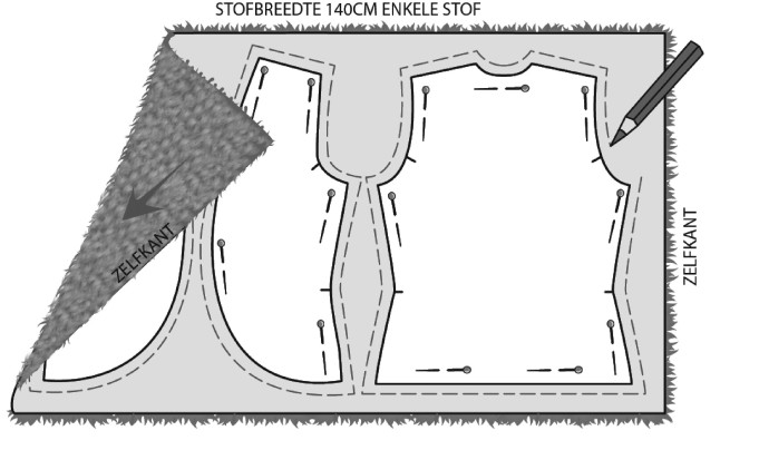 -Zorg dat je alle patroondelen in dezelfde richting op de stof legt. Soms heeft teddy of imitatiebont een ‘vleug’. Wanneer je daar geen rekening mee houdt zou je kleurverschil kunnen zien in je kledingstuk.