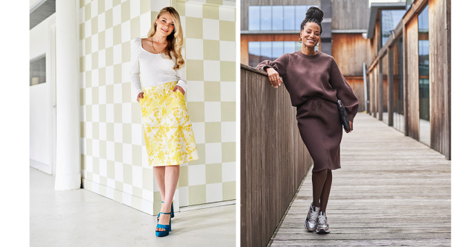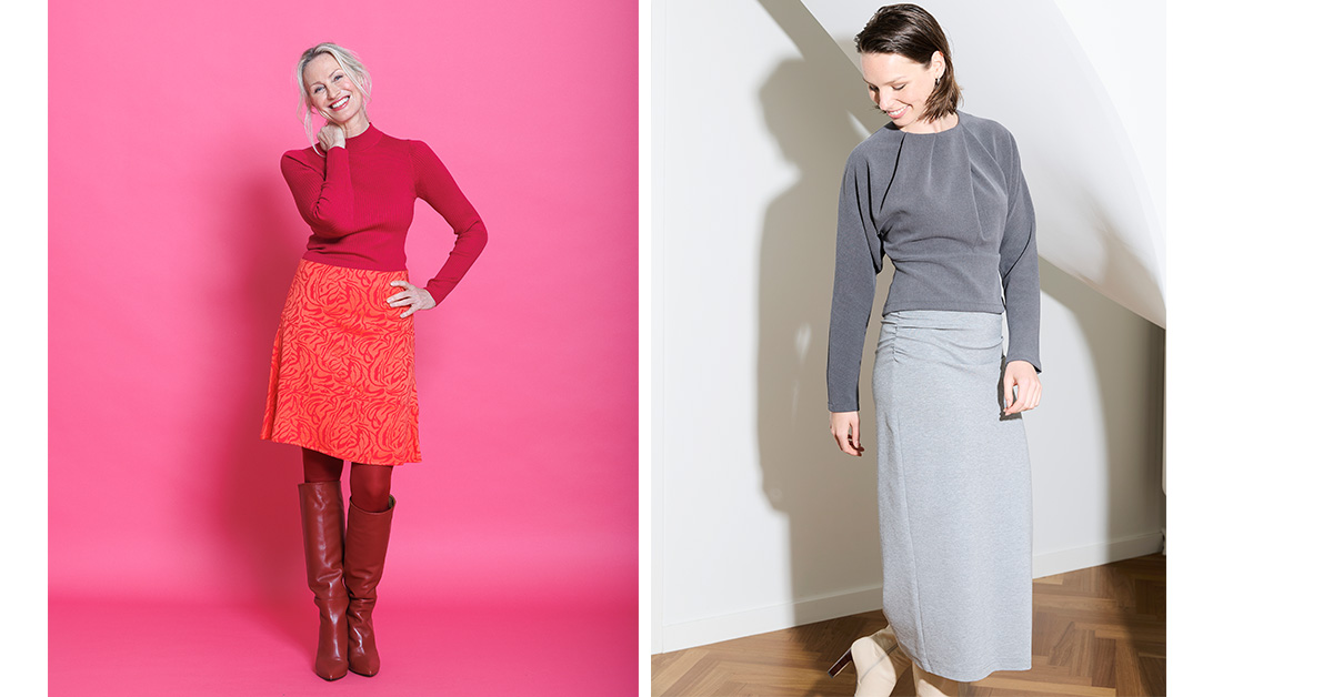 Heb je brede schouders, weinig taille en smalle heupen, dan kan een licht gerende rok – naar de zoom toe iets uitlopend – een mooie keuze zijn. Want die geeft je lijf meer vorm. Het voorbeeldpatroon – met steekzakken en een grappige tailleband – is zo’n model. Andere optie: de sweatrok, omdat die mooi volume en een leuke lengte heeft voor figuurtypes met slanke heupen.