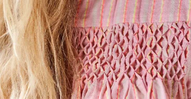 Momenteel zie je veel fijn, machinaal smokwerk. Dat is gemaakt met elastiek aan de binnenkant van het kledingstuk. Een heel ander effect krijg je met handmatig smokwerk, zoals bij deze top. Het model is aan de voorkant wijd en klokkend met een pas en daaronder een rand met een zogenaamd honingraat smokwerk. Het leuke van dit traditionele smokwerk is dat ook hier rek in zit! Bekijk hieronder de handige smok-tutorial.